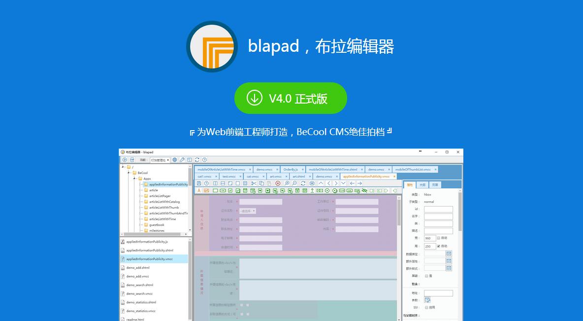 blapad - 布拉編輯器,是一款Web前端工程師使用的開發(fā)集成環(huán)境(IDE),集站點(diǎn)管理、目錄文件組織、頁(yè)面設(shè)計(jì)器、代碼編輯、生成、預(yù)覽等功能于一身。
