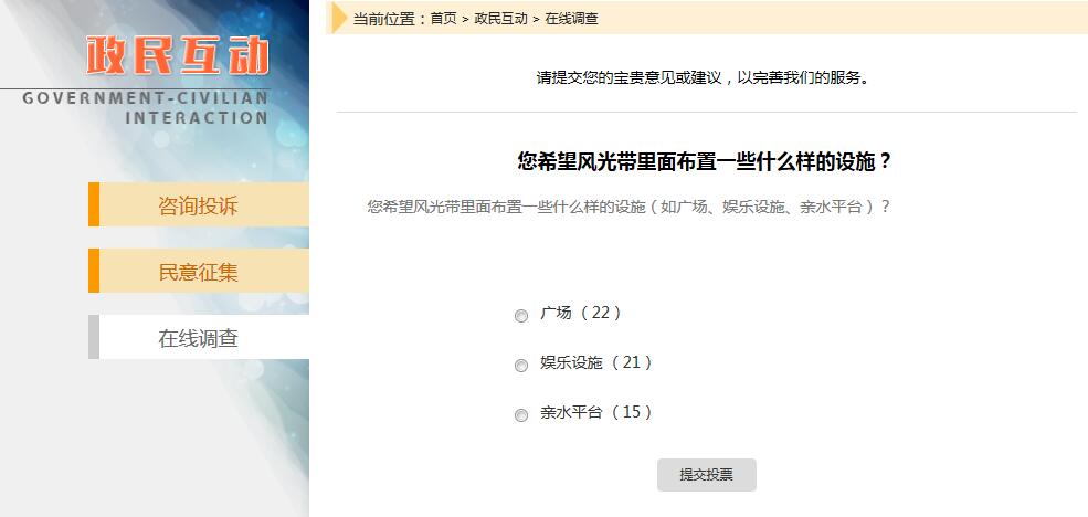 此功能政府類(lèi)官方網(wǎng)站使用頻率效高,在提高政務(wù)親民度和群眾參與度上有很好的作用。一般用于在線調(diào)查、在線投票、民意征集等欄目。