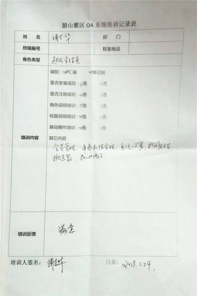 會(huì)后,我司該項(xiàng)目負(fù)責(zé)人還針對灌區(qū)超管進(jìn)行一對一培訓(xùn)指導(dǎo),對超管的獨(dú)有功能模塊進(jìn)行仔細(xì)講解,培訓(xùn)人對詳細(xì)的講解的效果表示滿意。并一起討論全員性培訓(xùn)方案。